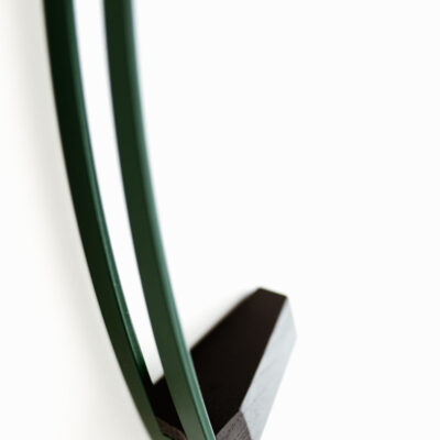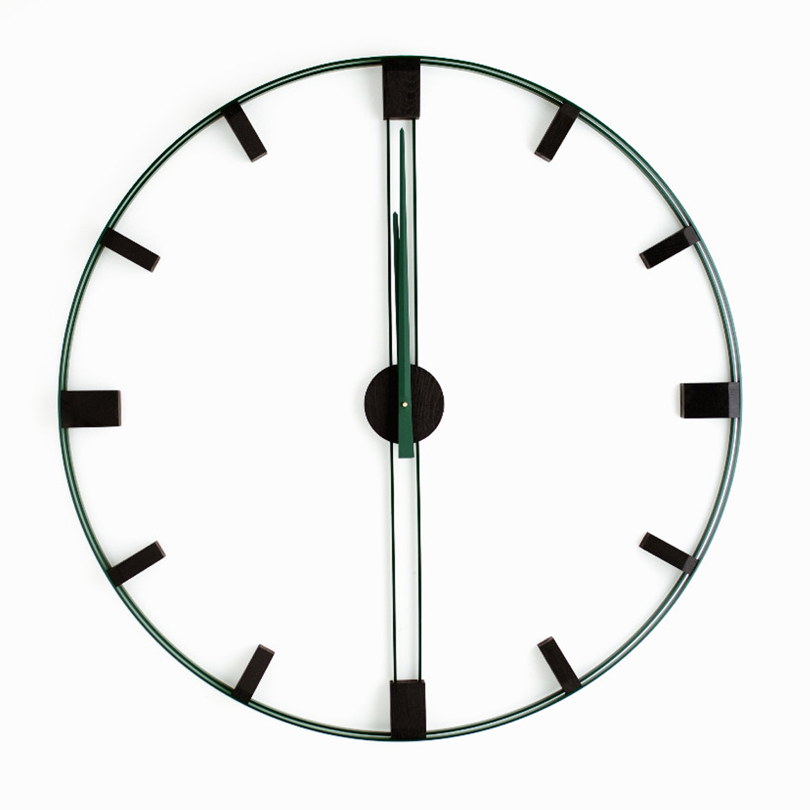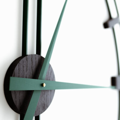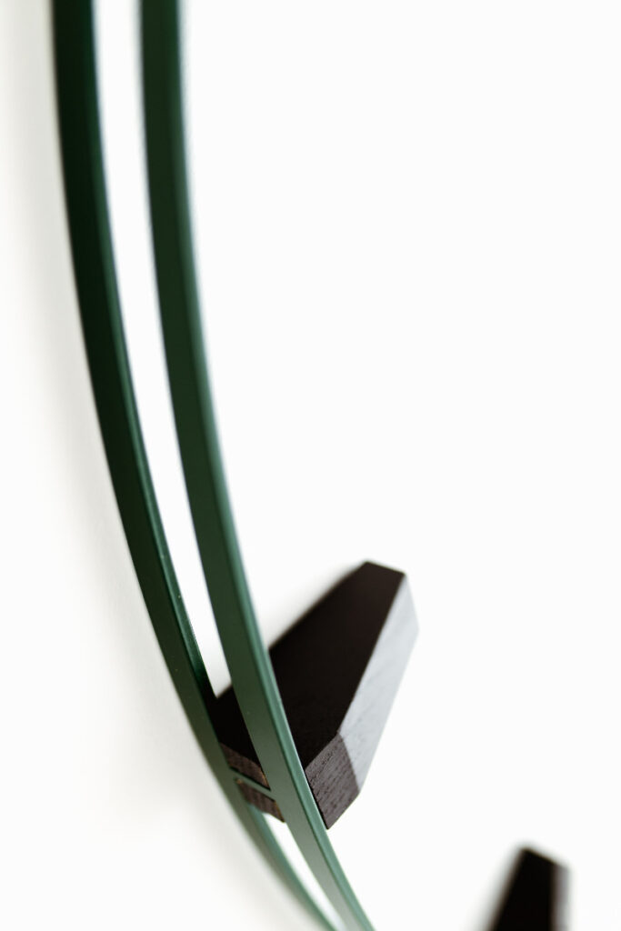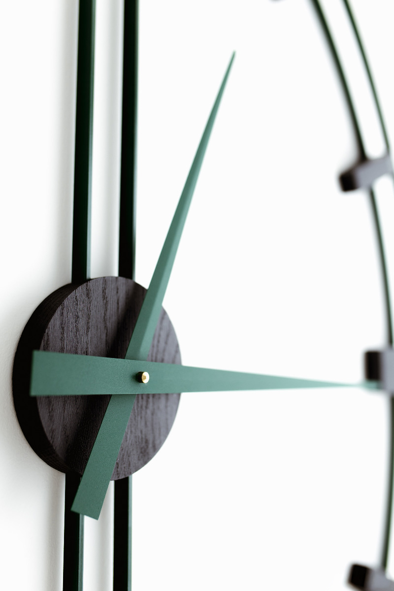 Unikalny charakter zegara buduje kontrast materiałów. Matowa, zielona stal obręczy doskonale współgra z centralnym elementem z litego dębu, barwionego na czarno. Drewno, zabezpieczone olejowoskiem, zachowuje swoją naturalną strukturę, co dodaje zegarowi szlachetności. Taki designerski zegar ścienny świetnie komponuje się z żywymi roślinami, ciemnym drewnem mebli czy welurowymi tkaninami, tworząc spójną i przytulną aranżację.