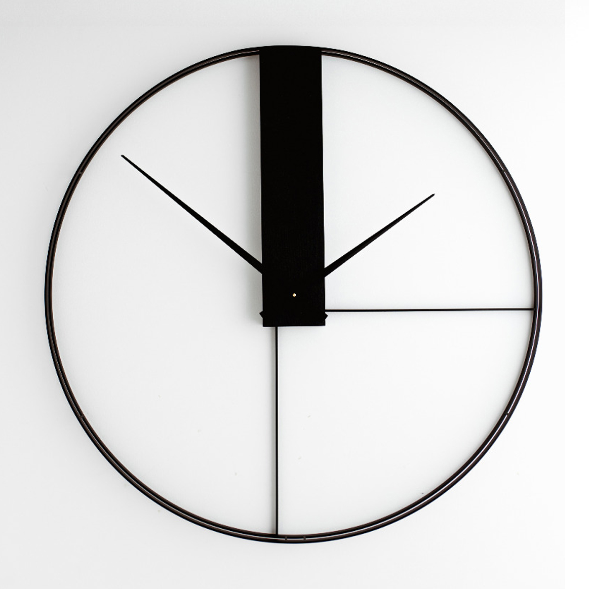 Monochromatyczny design zegara – połączenie głębokiej czerni stali i barwionego na czarno dębu – podkreśla jego nowoczesny i odważny charakter. Pomimo potężnych rozmiarów, ażurowa konstrukcja nadaje mu wizualnej lekkości, pięknie eksponując fakturę ściany, na której wisi. To nowoczesny zegar loftowy, który udowadnia, że minimalizm może iść w parze z rozmachem.