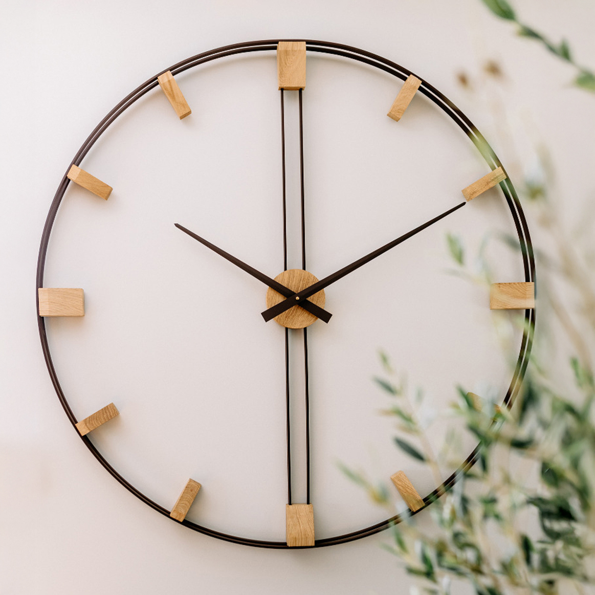 Ten duży zegar ścienny o średnicy 96 cm został zaprojektowany jako mocny, ale nadal minimalistyczny akcent na ścianę. Połączenie czarnej, matowej obręczy z jasnymi, dębowymi indeksami godzin tworzy wyrazisty kontrast, który przyciąga wzrok i doskonale dopełnia nowoczesny salon, jadalnię czy loftową przestrzeń.